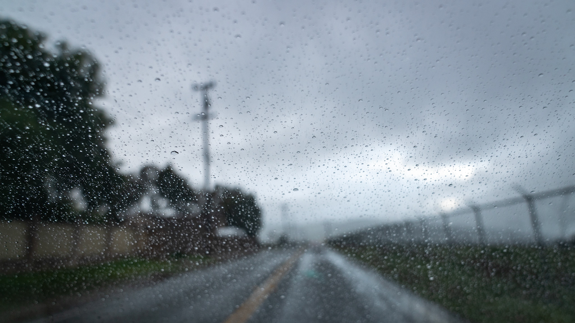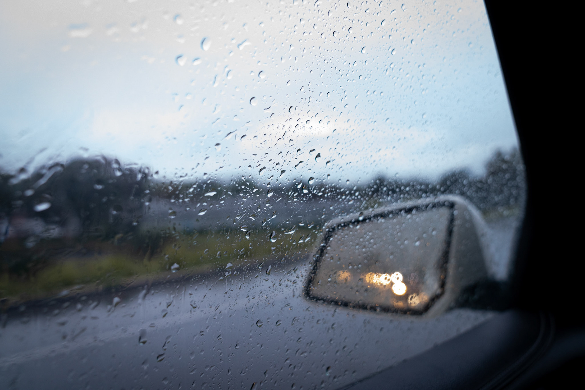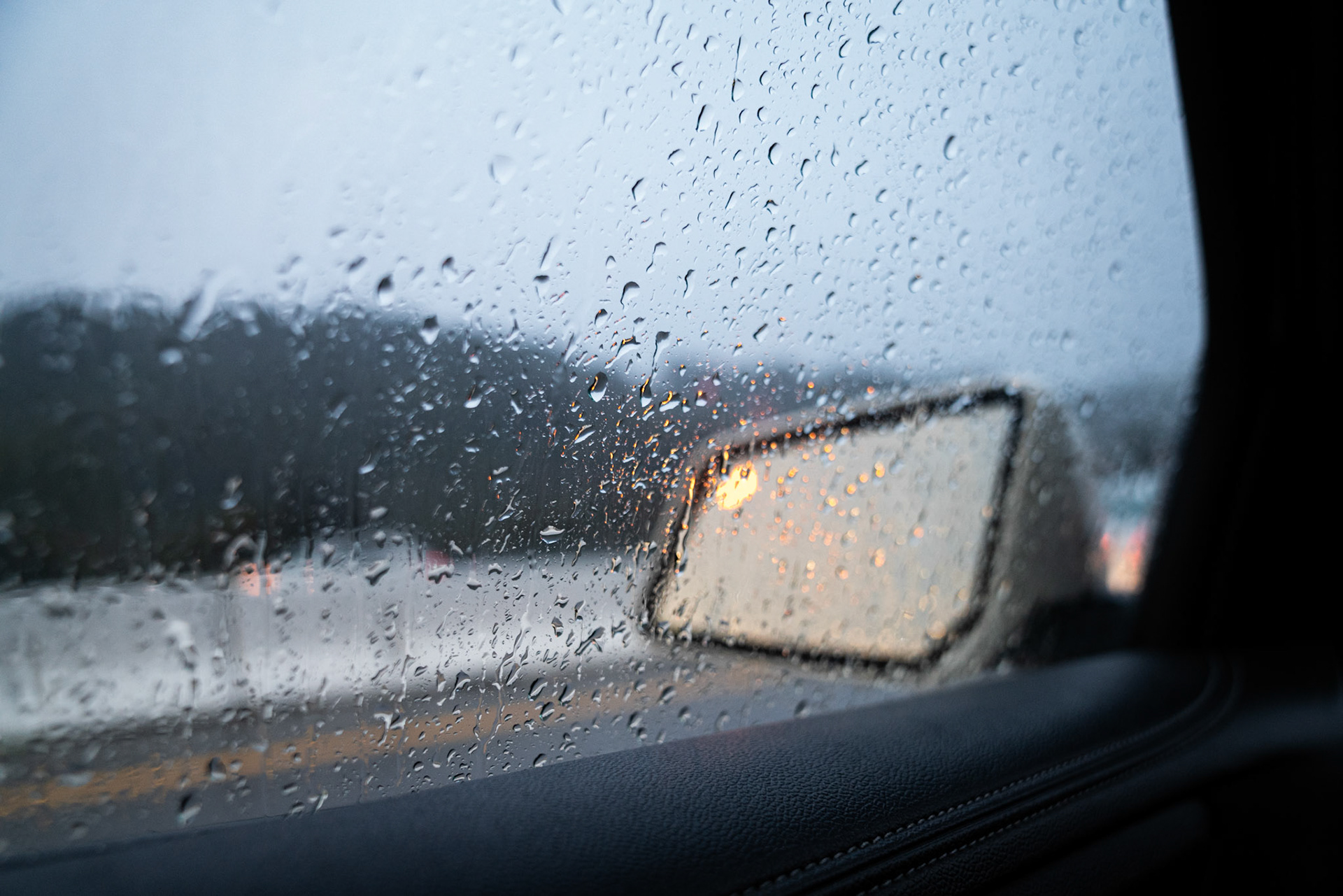 View out a car window through rain drops that blur the freeway and traffic outside the car. A phone is visble mounted on the car vent.